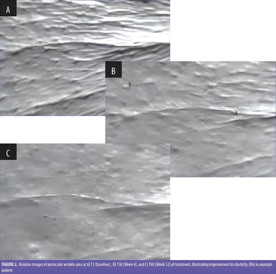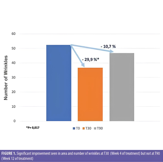 На 30-й день морщины в периокулярной области значительно уменьшились на 35,7% (р=0,003) по сравнению с исходным значением. В конце исследования (90 дней) наблюдалось значительное улучшение упругости кожи (41,7%) и эластичности (12,8%). Переносимость лечения оценена как «хорошая» или «очень хорошая» у 86,5% испытуемых.